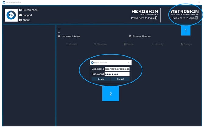 - Log in to the Hexoskin OneSync for Astroskin software using your username and password.