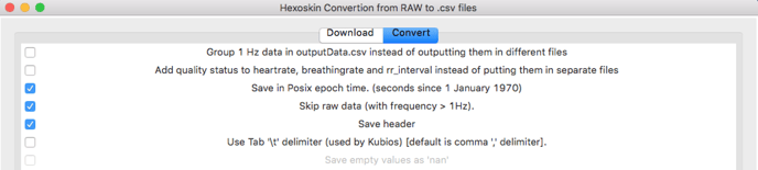 Alternativement, si vous téléchargez vos données avec notre logiciel HxConvertSourceFile, le temps vous sera présenté en secondes par défaut. Toutefois, vous pouvez cocher la case «Save in Posix epoch time (seconds since 1 January 1970)» pour que le temps soit automatiquement convertit en «époque» (ainsi nul besoin de diviser par 256). De cette manière, les données peuvent simplement être converties directement avec l'outil epoch & unix converter pour obtenir la date et l'heure du début de l'enregistrement/de l'activité.