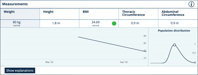Le graphique vous permet de suivre l'historique de la métrique de votre choix et la progression de votre état de santé. Veuillez noter qu'il faut au moins 2 entrées d'une donnée pour qu'un graphique puisse être généré.