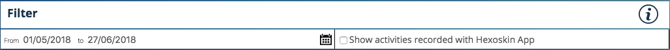 Dans la section «Filter» (filtre), vous pouvez utiliser  pour restreindre votre recherche d'enregistrements ou d'activités à une plage de temps spécifique. Cochez la case «Show Activities recorded with Hexoskin App» (afficher les activités enregistrées avec l'application Hexoskin) pour afficher uniquement les activités qui ont été lancées via l'application Hexoskin.