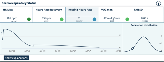 Les métriques de la section «Cardiorespiratory Status» (Statut Cardiorespiratoire) ne s'afficheront que lorsque vous aurez effectué et terminé les «Fitness Tests» (Tests de Condition Physique) sur votre Application mobile Hexoskin.
