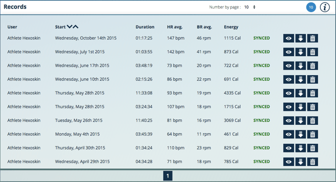 Dans la section «Records», vous pouvez accéder à vos enregistrements. Le nombre d'enregistrements par page peut être modifié au besoin. Le  permet de visualiser un enregistrement, le  permet de télécharger les données de l'enregistrement (au format .csv, binaire ou EDF) et le  permet de supprimer définitivement l'enregistrement du compte. Naviguez de page en page en cliquant sur le bouton de la page (1, 2, 3, etc.) ou avec les boutons  en bas de la liste des enregistrements.