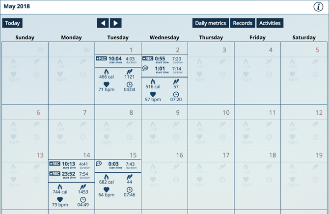 L'onglet "Calendar" affiche vos enregistrements, activités et/ou métriques quotidiennes sous un format mensuel.