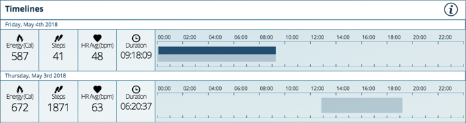 Dans la section «Timelines», vous trouverez le résumé des métriques de vos activités ou enregistrements et une ligne du temps qui s'affiche lorsque les enregistrements / activités ont eu lieu (c'est-à-dire des boîtes sur la ligne du temps).